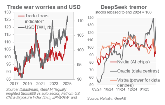 La renta variable europea repuntó en enero y el dólar se tomó un respiro (gráfico de la izquierda), ya que el aluvión de órdenes ejecutivas de Trump evitó los tan temidos aranceles universales. Esto está en consonancia con nuestras expectativas de que, en medio de toda la incertidumbre, Trump puede favorecer en última instancia un enfoque transaccional, utilizando los aranceles como moneda de cambio para obtener concesiones (como acaba de hacer con Colombia en materia de inmigración). Pero no hay lugar para la complacencia: los aranceles punitivos a México, Canadá (25%) -pospuestos hasta el próximo mes- y China (10%) y un «arancel suplementario global» están sobre la mesa. Trump también ha prometido imponer aranceles a los chips, los productos farmacéuticos y el acero. Espere volatilidad debido a la incertidumbre política a medida que la agenda de Trump va tomando forma.