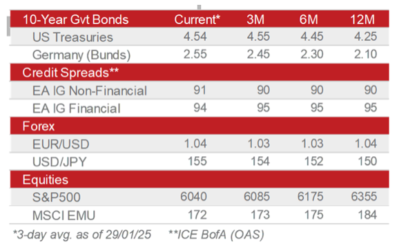 Después de moverse en gran medida en sincronía en 2024 (-100 puntos básicos cada uno), los caminos de la Fed (al margen por ahora) y el BCE (nuevos recortes secuenciales en medio del estancamiento económico y la relajación del crecimiento salarial) han comenzado a divergir. Es probable que la desinflación siga siendo lenta, pero los riesgos para los precios tienen ahora dos caras en Estados Unidos, debido tanto a la mayor resistencia de la economía como a los riesgos políticos de la agenda MAGA de Trump. Tras el aumento de los rendimientos hasta finales de 2024, seguimos apostando por una mayor exposición a la duración. Los segmentos más largos de la renta fija europea parecen ahora atractivos, ya que los rendimientos del Bund a 10 años rondan el 2,5% a pesar de la desinflación arraigada, el estancamiento de la economía y los nuevos recortes del BCE que se avecinan. La renta fija estadounidense, por el contrario, requiere una postura más prudente en medio de un crecimiento sólido y riesgos de inflación de doble cara.