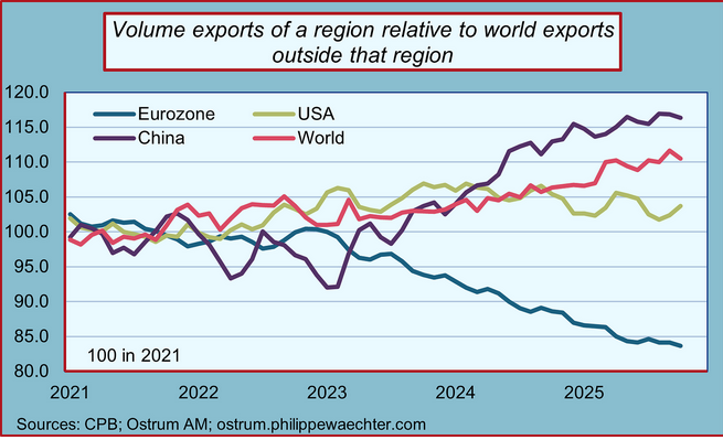 En solo unos pocos años, las diferencias son considerables. Para la zona euro, el descenso relativo de la producción y, especialmente, de las exportaciones sugiere una pérdida de competitividad en los precios, de capacidad de innovación y de calidad de los productos de la zona.