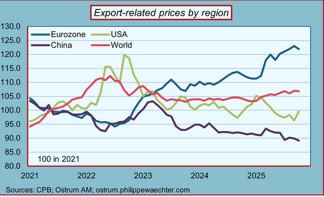 El índice de precios de exportación muestra una fuerte competitividad de los precios en China, mientras que los precios en la zona euro se han vuelto demasiado altos. La situación es neutra en Estados Unidos.