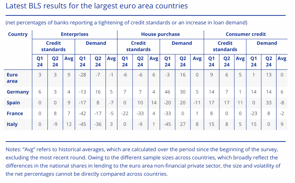 Empresas: (1.1) La banca endurece ligeramente las condiciones de financiación en 2T 2024 (Alemania y Francia, sobre todo, pero se relajan en Italia). El endurecimiento es generalizado por sectores, sobre todo en el inmobiliario terciario (oficinas…), (1.2) la banca planea endurecer “algo más” las condiciones de financiación en 3T 2024 y (1.3) la caída en la demanda de crédito se explica por las subidas de tipos del BCE y la contracción de la inversión empresarial.