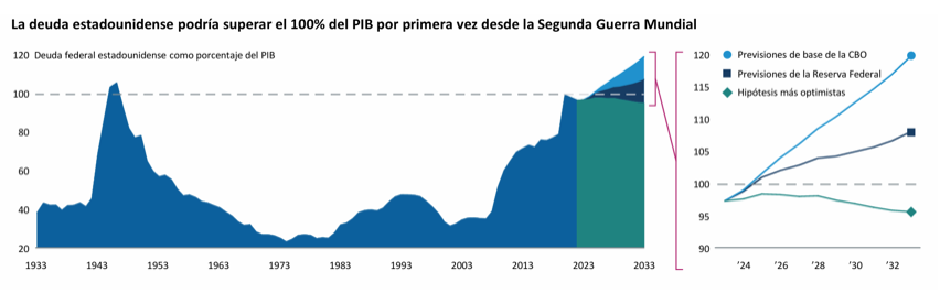 Darrell Spence (Capital Group) | ¿Cuándo es demasiado alto el nivel de deuda? Esa es la cuestión, ya que a los ciudadanos y los inversores estadounidenses cada vez les preocupa más el elevado nivel de deuda pública. La deuda total superó los 29 billones de dólares en el cuarto trimestre de 2024, acercándose así al 100% del producto interior bruto (PIB). Y la Oficina de Presupuestos del Congreso anticipa que seguirá aumentando en el futuro.