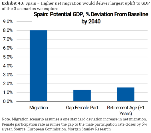Morgan Stanley | Nuestro analista de macro europea Jens Eisenschmidt ha publicado un informe en el que estima que el envejecimiento de la población europea tendrá un impacto negativo del 4% en el GDP de la Euro Zona para 2040. No obstante, reconoce que la implementación de diferentes políticas podría contrarrestar esta tendencia. Eisenschmidt estima que los mayores niveles de inmigración, el aumento de la edad de jubilación o la reducción del gap de participación laboral entre mujeres/hombres podrían impulsar el GDP entre un 1.3%/2.5% para 2040. En España, el economista señala que el incremento de la edad de jubilación podría impulsar el GDP en 1.6pp para 2040 (ligeramente por encima del 1.3pp de la Euro Zona), mientras que el impacto a largo plazo de la inmigración debería ser mucho más significativo, llegando a proporcionar 8pp de crecimiento adicional para 2040 (~50pb/año). En cambio, no espera que la reducción del gap de empleo entre hombres/mujeres tenga un impacto realmente significativo.