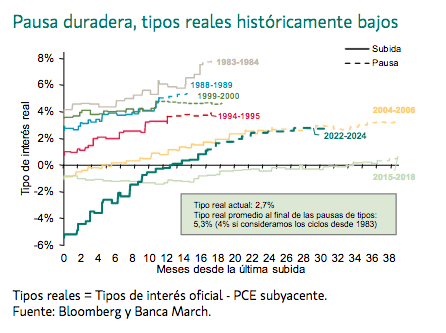 En primer lugar, los tipos de interés reales no son muy elevados si se contemplan en términos históricos, por lo que la presión sobre la economía es más liviana. Esta vez han llegado al 2,7%, que es casi la mitad del