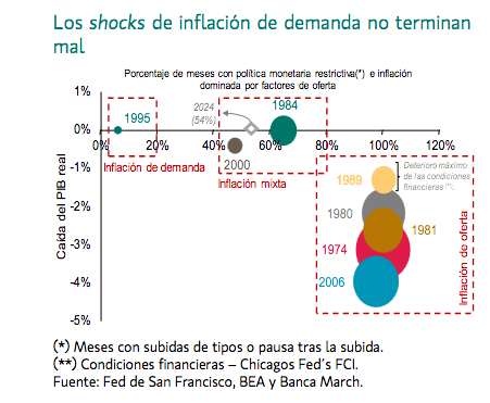 Mirando al pasado, los ciclos que fueron antecedidos por shocks de inflación de oferta concluyeron en fuertes recesiones. Sin embargo, cuando el shock vino por el lado de la demanda o fue mixto, como en este ciclo, el de mediados de los 80 o el de 1995, la Reserva Federal fue capaz de articular un aterrizaje suave ya que el
