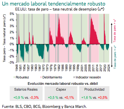 El tercer aspecto especialmente característico de este ciclo es que nos encontramos en un mercado laboral tendencialmente robusto dado que la tasa de paro es menor que la tasa natural de desempleo. Una situación que, cuando se produce, se suele extender en el tiempo generando unos salarios reales más elevados, que las empresas incrementen su inversión y una mayor productividad. Sin duda estas variables ayudan a explicar la