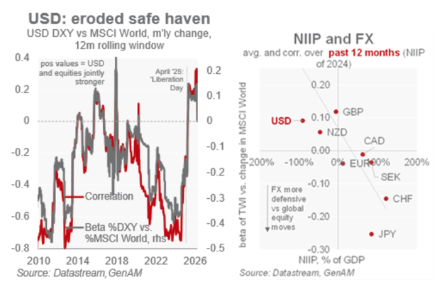 El aumento de los precios del petróleo suele favorecer a las monedas de los países exportadores de energía, mientras que las de los importadores se ven lastradas. Desde que el auge del petróleo de esquisto convirtió a EE. UU. en un exportador neto de petróleo en 2020, el dólar estadounidense ha mostrado una relación positiva con los precios del petróleo. Antes de la guerra, un aumento del 10% en el Brent solía ir acompañado de una apreciación del 0,5-0,6% del índice DXY del dólar estadounidense. Según este indicador, las recientes ganancias del dólar pueden explicarse íntegramente por el aumento de más del 50% en los precios del petróleo desde el inicio del conflicto. En consonancia con esta interpretación, nuestro modelo euro/dólar no apunta a una prima de riesgo significativa del dólar (. Además, desde la toma de posesión del presidente Trump, el dólar se ha movido al alza junto con el sentimiento de riesgo global, lo que refuerza la opinión de que su tradicional papel de refugio seguro se ha erosionado. En este sentido, el dólar se asemeja ahora al patrón general del G10, donde las divisas refugio suelen estar respaldadas por balances externos sólidos, en particular una posición de inversión internacional neta (NIIP) positiva, como se observa en el caso del yen y el franco suizo. El reciente bajo rendimiento de estos refugios tradicionales subraya aún más el predominio del canal del precio del petróleo en el contexto actual. Un conflicto prolongado seguiría respaldando al dólar estadounidense, mientras que una caída de los precios de la energía tras un alto el fuego desmontaría gran parte de la fortaleza reciente.
