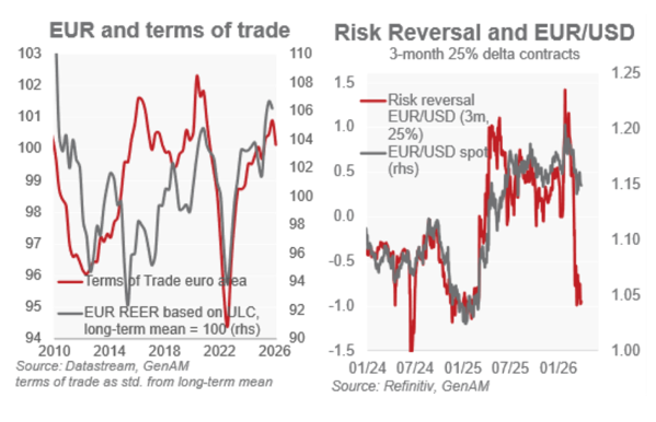 Aunque seguimos esperando que el dólar estadounidense reanude su descenso si la guerra con Irán termina pronto, tal y como se supone en nuestro escenario base, ahora consideramos que este movimiento será más limitado que antes de la guerra. En primer lugar, es probable que los precios de la energía se mantengan elevados durante más tiempo en comparación con las perspectivas previas a la guerra, lo que implica dificultades más persistentes en los términos de intercambio para el euro y el yen. En segundo lugar, la recuperación de la zona euro en el presente año —fundamental para una apreciación sostenida del euro— será más moderada incluso en el escenario base.