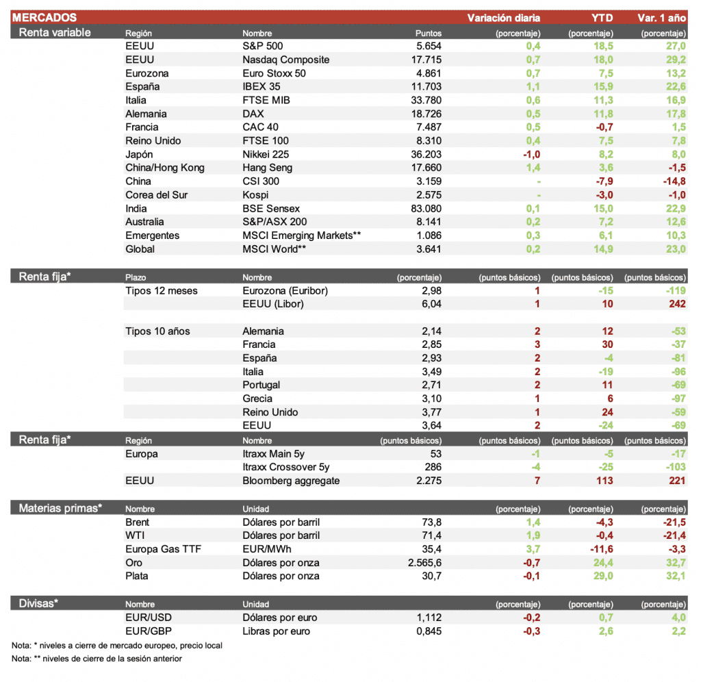 Las bolsas mantienen el tono positivo de las últimas sesiones con el inicio de las rebajas de tipos en Estados Unidos como el factor fundamental detrás de las subidas. La estabilización de los valores tecnológicos tras la corrección de julio-agosto y un mayor optimismo sobre el aterrizaje suave de la economía estadounidense han devuelto a los índices a la zona de máximos anuales.