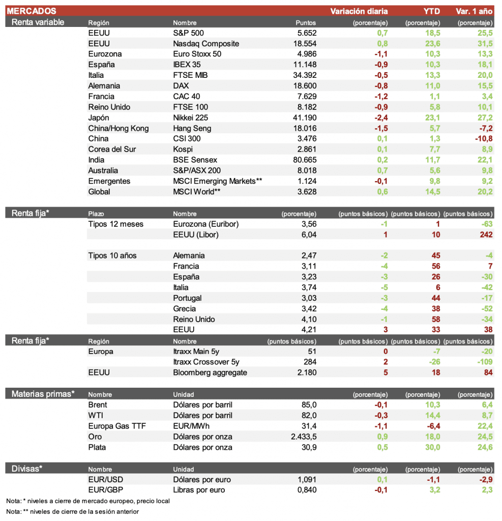 En Europa hemos vivido una sesión negativa destacando la caída del grupo relojero Swatch y la marca de lujo Burberry donde ambas están sufriendo deterioro en ventas debido a la debilidad de la demanda en China. En España, la peor parada es Grifols (-6,2%) despues de que Moodys haya decidido quitarle su rating crediticio. Brookfield continúa estudiando la posible OPA sobre la empresa.