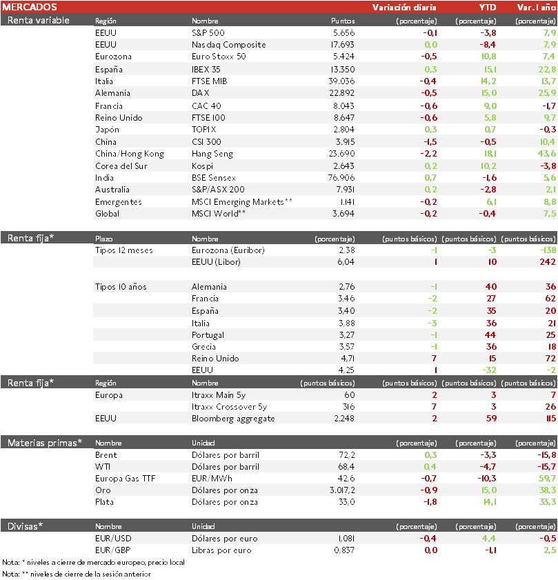 Así, la TIR del Bund a 10 años ha descendido 1 pb a2,76% y Treasury a 10 años sube 1 pb hasta un 4,25%.