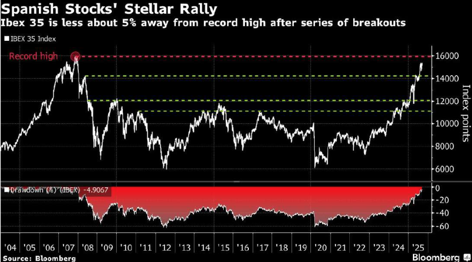 El índice Ibex35 ha subido un +30,77% en 2025, la mayor subida entre los principales indicadores europeos, en su quinto año de racha alcista que lo ha situado a un 5% del récord. Los días de la crisis financiera mundial y el desplome del mercado inmobiliario español tras el pico de 2007 han quedado atrás, reemplazados por un fuerte crecimiento económico y un renovado interés por el sector bancario español.