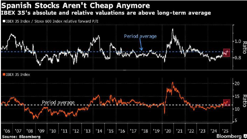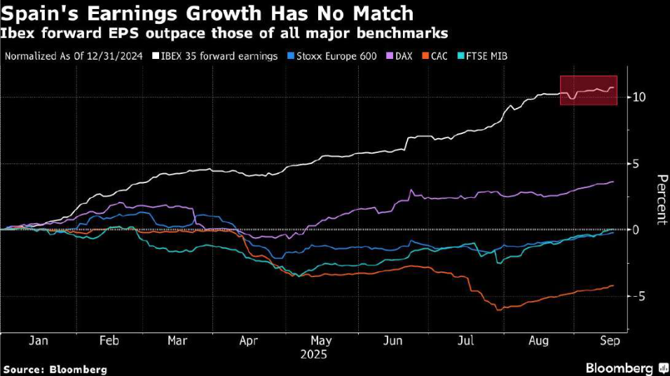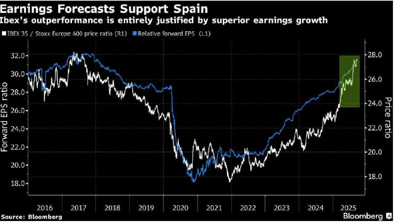 La economía destaca en comparación con sus vecinos, y se prevé que el crecimiento vuelva a superar con creces a sus homólogos de la UE en 2025. El desempleo es el más bajo desde 2008, mientras que el turismo y la demanda interna están en auge. Los hogares se han desapalancado desde la crisis financiera mundial y los bancos han experimentado una sólida recuperación. Esto convierte a España en un gran atractivo para los inversores, sólo por detrás de Alemania como el mercado preferido en la encuesta de gestores de fondos europeos de Bank of Amefica publicada esta semana.