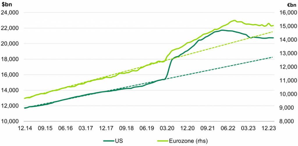 ¿Qué ha ocurrido con M0, M1 y M2 desde entonces? A grandes rasgos, la respuesta es que ya no crecen como en la época de la pandemia. La observación más interesante en nuestra opinión es la comparación de las tendencias prepandémicas en la M2. El siguiente gráfico muestra los datos de M2 para EE.UU. y Europa. Como puede verse, M2 en Europa casi ha vuelto a la tendencia de crecimiento anterior a la pandemia. Mientras que, en EE.UU., la M2 tendría que disminuir algo más del 10% para volver a la misma tendencia. Esto pone de relieve que la naturaleza del choque inflacionista en Europa fue un poco diferente de lo que vimos en Estados Unidos. El impacto de la crisis energética en la oferta desempeñó un papel muy importante en Europa, mientras que en EE.UU. los problemas inflacionistas han estado más impulsados por la demanda, ya que los paquetes de estímulo fueron mayores y la economía es más dinámica.