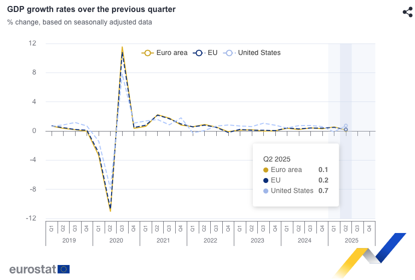 CdM | La economía de la Eurozona frenó su expansión en el segundo trimestre, cuando el Producto Interior Bruto (PIB) apenas avanzó un 0,1% frente al crecimiento del 0,6% registrado en el trimestre anterior, según la estimación preliminar publicada por Eurostat, la oficina de estadística de la Unión Europea (UE).