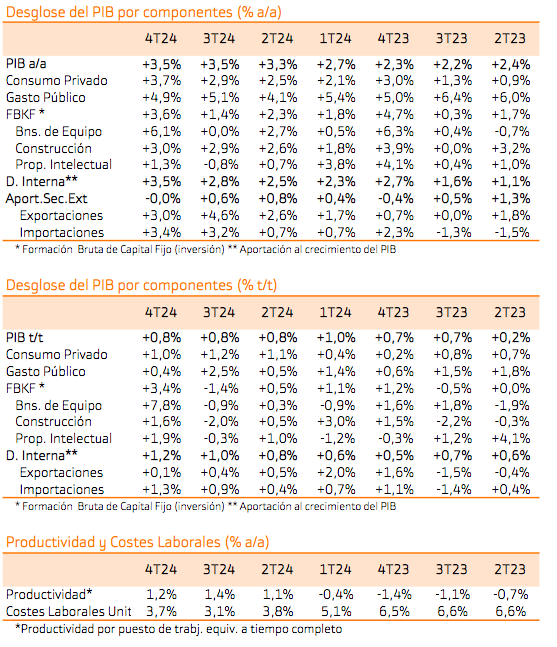 La economía mantiene la fortaleza en el 4T 2024 +3,5% a/a y continúa la tendencia de crecimiento de la Demanda Interna (que aporta prácticamente todo), frente a la ya casi nula contribución del S. Exterior. Dentro de la Demanda Interna destaca la mejora de la Formación Bruta de Capital Fijo (+3,6% a/a), en particular en Bienes de Equipo (+6,1% a/a) y Construcción (+3% a/a), hasta el momento las partidas más rezagadas en la recuperación