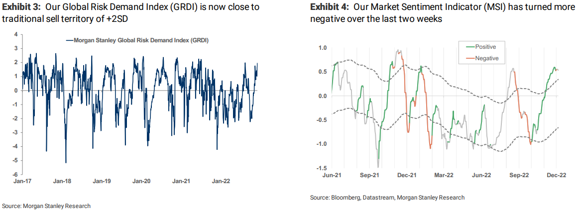 Es más, el “z-score” se evidencia que el buen comportamiento relativo de Cíclicas es consistente no solo con el del índice sino también con el visto en los spreads tanto de crédito IG como HY. Por tanto, aunque el análisis puede sugerir que las Cíclicas no caerán hasta que no lo haga el mercado Graham destaca que algunos de los indicadores técnicos más importantes como el MS Global Risk Demand Index (GRDI) o el MS Sentiment Indicator (MSI) están empezando a dar señales de venta y de deterioro del sentimiento respectivamente lo que apunta a un mayor riesgo a la baja para las Cíclicas.