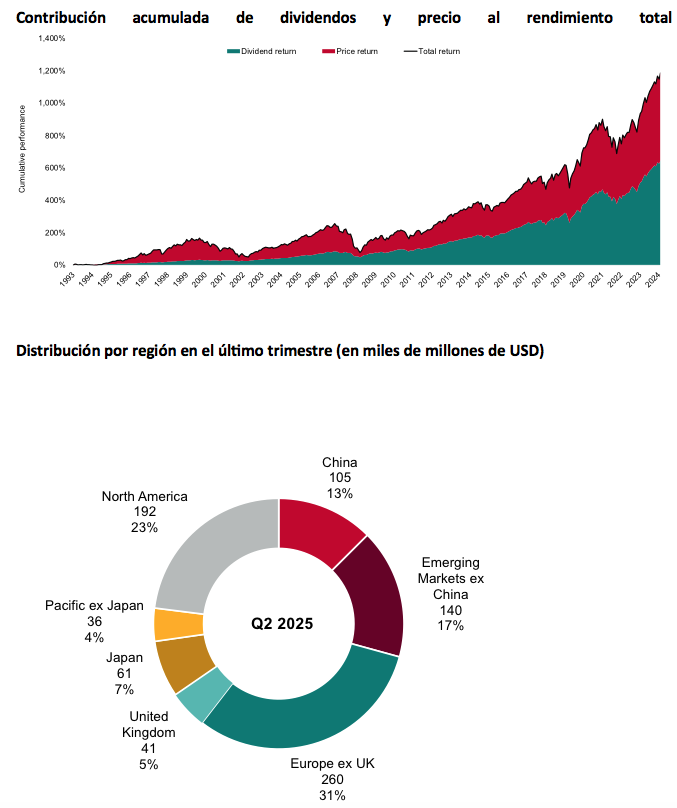 Los dividendos siguen siendo un componente esencial de la rentabilidad bursátil a largo plazo. Desde 1993, el índice FTSE All-World ha crecido más de un 1.200%, de los cuales cerca de 600 puntos porcentuales se atribuyen a la reinversión de dividendos. Una tendencia que previsiblemente ganará aún más relevancia en un entorno de mercado caracterizado por la incertidumbre y las tendencias estanflacionarias.