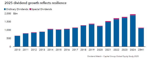 Capital Group | Tras un primer semestre muy sólido, 2025 se perfila como otro buen año para los dividendos mundiales. En la segunda mitad del año, Estados Unidos, donde los pagos se distribuyen de manera muy uniforme entre los distintos trimestres, parece dispuesto a continuar con la alentadora tendencia actual.