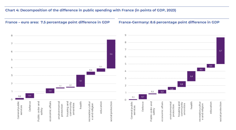 En lo que respecta a Francia, en 2024 el país galo se erigió como el segundo estado de la eurozona en gasto público (57,1% del PIB), solo superado por Finlandia, y sigue muy por encima de la media europea y de países como Italia, Alemania y España. Esta situación se explica principalmente por su gasto en pensiones y sanidad. Así, “el gasto sanitario en Francia incluye una gran proporción de atención personal y servicios hospitalarios, mientras que en Alemania una parte importante de estos cuidados está cubierta por compañías de seguros privados”, sostiene el documento.