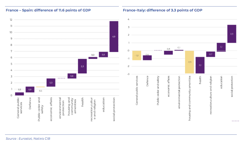 Tal y como señala nuestro análisis, el gasto en pensiones y seguridad social en España es notablemente inferior al de Francia, principal país analizado: la diferencia en gasto público en seguridad social entre ambos países es de 4,9 puntos del PIB, mientras que en pensiones de 2,9 puntos.