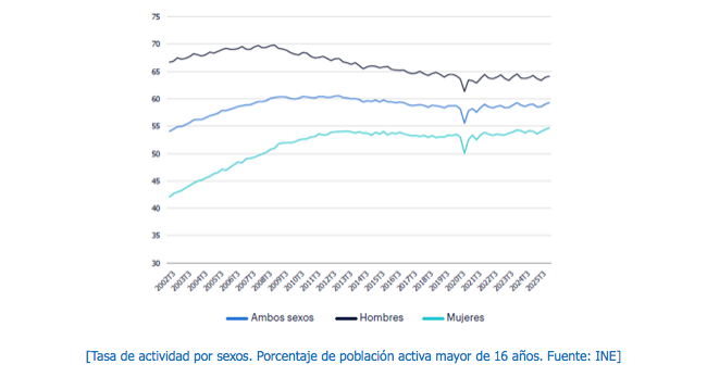 La tasa de actividad se situó en septiembre en el 59,3%, con una diferencia entre hombres y mujeres de 9,4 puntos a favor de los primeros. En el contexto europeo, la tasa de actividad en España se sitúa entre las más bajas de la UE como consecuencia de la menor participación en el mercado laboral de población a partir de los 55 años, por las mayores prejubilaciones o, simplemente, abandono del empleo. También influye la menor participación femenina, sobre todo a partir de la población con 50 años.