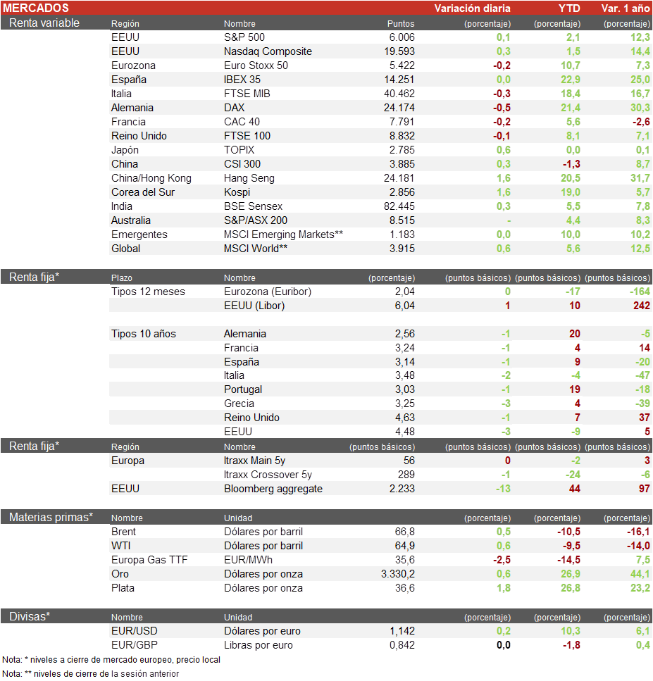El barril de Brent ha aumentado un 0,5% hasta los 66,8 $ tras la última decisión de la OPEC sobre la producción. El EUR/USD se mantiene al alza en la sesión y se sitúa en torno a 1,142.El oro aumenta un 0,6% y se sitúa en los 3.330 $/onza, en una sesión positiva.