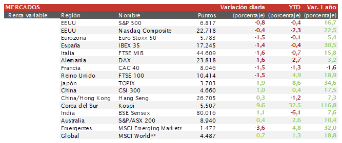Álvaro Romero (Singular Bank) | Los principales índices europeos han cerrado la sesión de forma negativa. El Ibex 35 ha cerrado con un descenso del 1,38% con las empresas más expuestas al comercio con Estados Unidos sufriendo. El CAC 40 francés ha descendido un 1,5% debido al descenso de los sectores de consumo y defensa.