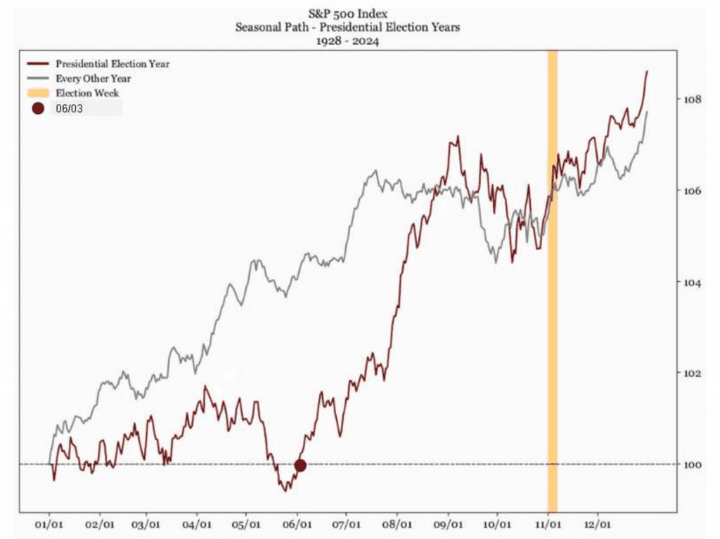Renta 4 | Como expusimos el pasado mes de abril en el informe técnico de Perspectivas 2024, los mercados americanos comienzan el mes de junio en un periodo estacionalmente positivo, que abarca teóricamente desde junio hasta primeros de septiembre, esperándose entonces una corrección previa a las elecciones presidenciales de noviembre. Como podemos ver debajo, el periodo abril-mayo se esperaba también menos rentable, como así ha sido: