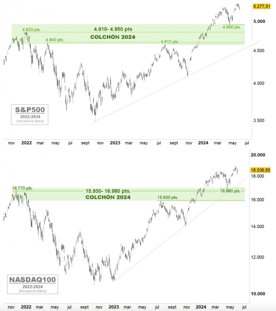 Los colchones de 2024 claves para las bolsas americanas. Debajo mostramos los niveles clave de soporte para el S&P500 y para el NASDAQ100, cómodos colchones ante un eventual escenario correctivo. En el caso del S&P500, la franja entre 4.610 y 4.950 puntos se presenta clave, al igual que la franja entre 15.930 y 16.980 puntos para el tecnológico NASDAQ100: