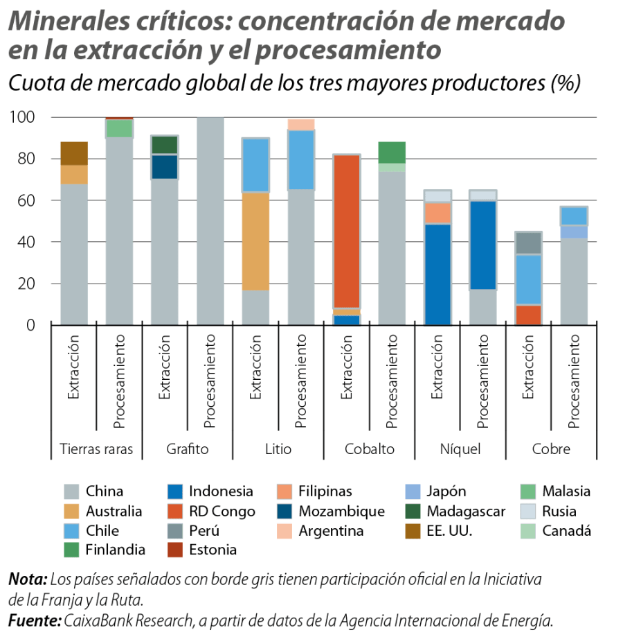 Asimismo, la concentración geográfica en la minería y el procesamiento de estas materias primas aumentó en la última década. En este entorno, China sigue destacando como la mayor potencia en el procesamiento de estos minerales y llega a cuotas de mercado superiores al 70% en el refino de un amplio espectro de productos (véase el primer gráfico).