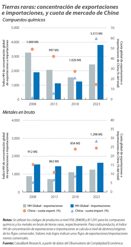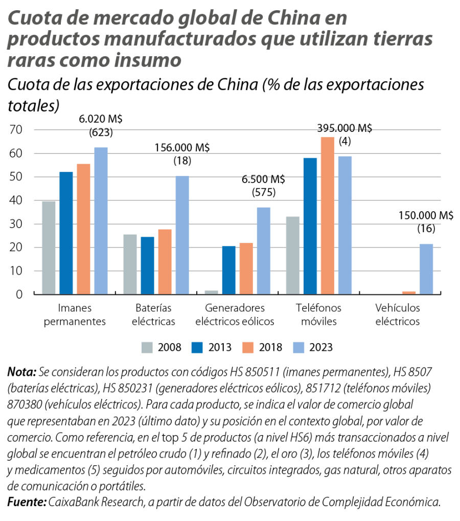 En concreto, se ha observado en los últimos años una reducción progresiva de la cuota global de exportaciones de China (de cerca del 50% al 15% actual) en los compuestos químicos de tierras raras (precursores de metales en bruto), al mismo tiempo que su cuota global de importaciones ha aumentado con particular fuerza desde 2018, hasta llegar al 60% actual (véase el tercer gráfico). En este contexto, se ha producido una rápida concentración de las importaciones a nivel global, en la que China (tercer mayor exportador) absorbe la práctica totalidad de las importaciones de Myanmar (mayor exportador) y el 40% de las de Malasia (segundo mayor exportador). Por otro lado, en las tierras raras en formato metálico bruto o en artículos manufacturados, las cuotas de exportación de China se han mantenido relativamente estables, en tanto que sus cuotas de importación han aumentado, en especial en fases menos avanzadas del procesamiento de estos productos. Así, la estrategia de China ha buscado un dominio de las reservas, la extracción y el procesamiento de tierras raras, una integración vertical que otorga al gigante asiático una hegemonía prácticamente incontestada en el sector, y una ventaja única para las industrias que dependen de estos insumos críticos.