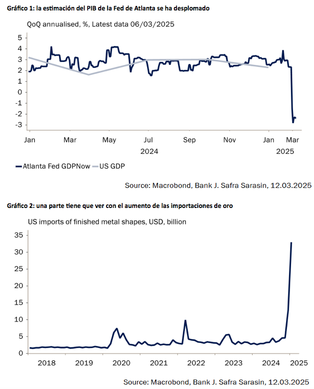 Comencemos por el corto plazo. No cabe duda de que la economía se está ralentizando. La estimación del PIB (GDPNow) de la Fed de Atlanta se ha desplomado hasta el -2,8% antes de repuntar ligeramente hasta el -2,4%, lo que hace temer que la economía esté empeorando (Gráfico 1). La lectura es probablemente demasiado pesimista, en parte debido a un incremento de las importaciones en enero, ya que las empresas se abastecieron antes de los aumentos arancelarios previstos. Casi la mitad del aumento se debió a un incremento de las importaciones de oro, que se excluyen del cálculo oficial del PIB (Gráfico 2). Teniendo en cuenta esta distorsión, la Fed de Atlanta estima el crecimiento del primer trimestre en un 0,4%. Esta cifra sigue siendo débil y refleja la caída de los datos sobre la confianza empresarial y de los consumidores, que se utilizan para estimar partes del modelo. Sin embargo, los «datos duros», como el informe de empleo de febrero y los datos JOLTS de enero sobre los flujos del mercado laboral, han resistido mejor. En nuestra opinión, es más probable que el crecimiento del PIB este trimestre se sitúe en torno al 1%. Esto marcaría una desaceleración significativa desde finales de 2024.