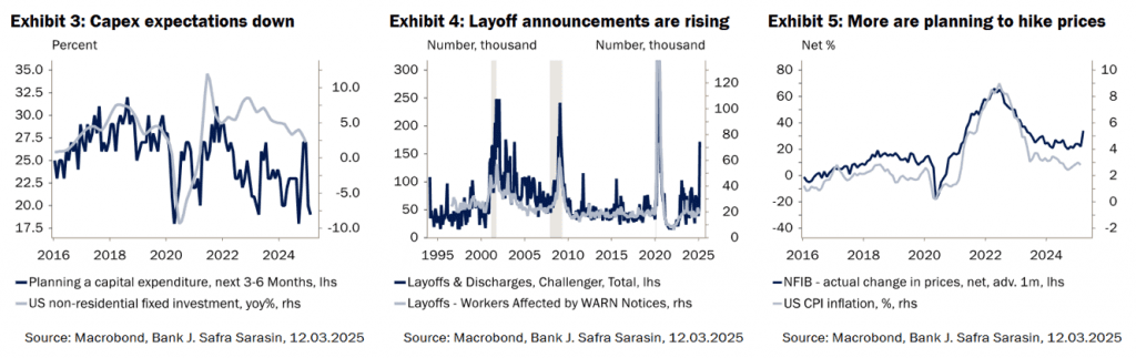 Las perspectivas a corto plazo tampoco parecen halagüeñas. La confianza del consumidor ha caído en picado, en parte debido al incremento de las expectativas de inflación y a la caída de los mercados de renta variable. El optimismo de las pequeñas empresas, medido por el índice NFIB, ha caído por segundo mes consecutivo en febrero. Este índice, que se inclina por los republicanos y se disparó tras la victoria electoral de Trump, registró su mayor descenso desde la pandemia en la proporción de propietarios de negocios que decían que era un buen momento para ampliar su actividad. Otros sondeos, como el PMI Global de S&P y los realizados por los bancos regionales de la Fed, también apuntan a unas intenciones de inversión y contratación más débiles. La medida de nuevas ofertas de empleo de Indeed cayó en febrero, mientras que la medida Challenger de anuncios de despidos se disparó hasta niveles de recesión. Los recortes de empleo en el gobierno federal han impulsado en gran medida esta tendencia, pero los anuncios de despidos también han aumentado considerablemente en el sector minorista. Por último, el porcentaje neto de empresarios que aumentaron sus precios de venta subió 10 puntos porcentuales en febrero, el mayor incremento mensual desde abril de 2021. La mayoría de los componentes de los precios de los PMI globales ISM y S&P también han subido en los últimos meses (Gráficos 3-5).