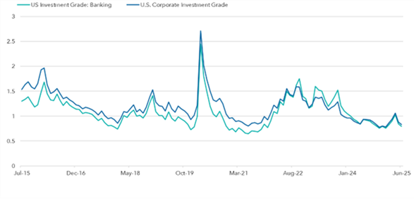 Los fundamentales crediticios de los seis grandes bancos comerciales de Estados Unidos siguen siendo sólidos. Como reflejo de ello y del favorable contexto económico, los diferenciales se han reducido significativamente tanto en términos absolutos como en relación con el mercado de bonos corporativos en general. Creemos que uno de los factores clave que contribuye a impulsar los diferenciales de los bancos comerciales es la oferta neta y, dado que los diferenciales se encuentran ahora reducidos y se espera que la emisión neta de los bancos sea positiva durante la segunda mitad del año, podría resultar difícil lograr una mayor reducción.