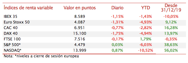El fuerte repunte que han experimentado las TIRes de los bonos en Europa ha frenado la recuperación de las bolsas con que se inició la semana. Así, los principales índices europeos cierran su cuarta semana consecutiva de descensos con un retroceso en el entorno de un 1%. Los índices estadounidenses, por su parte, registran una ligera recuperación en el conjunto de la semana de un 1% (datos al cierre europeo) tras las fuertes caídas acumuladas desde el inicio del año.