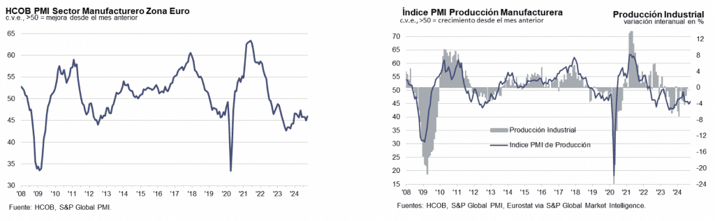 En concreto, los niveles de producción industrial siguieron disminuyendo en la zona euro en octubre. Aunque el ritmo de contracción se ralentizó desde septiembre, fue sólido y en líneas generales estuvo en concordancia con el promedio observado durante la secuencia actual de 19 meses de declive.