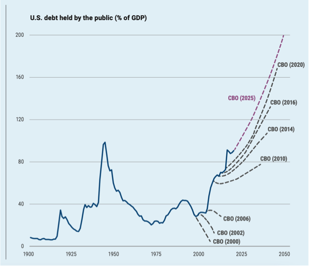 Las últimas previsiones sugieren que, si no se toman medidas, en 2050 la deuda estadounidense podría acercarse al 200 % del PIB. Si no se modifican las políticas actuales, la deuda estadounidense seguirá aumentando.