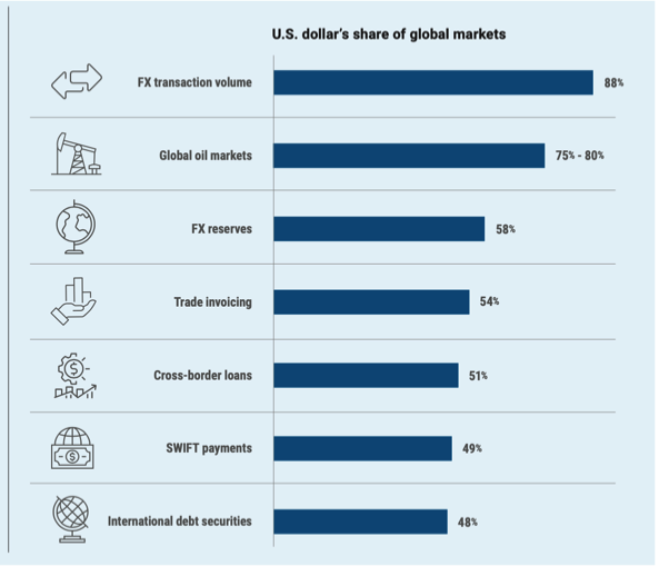 Su uso generalizado en el comercio y las finanzas mundiales, junto con la falta de alternativas viables, respalda esta situación. Por ejemplo, el dólar representa aproximadamente el 88 % del volumen mundial de transacciones en divisas, lo que refleja su papel central en los mercados internacionales y refuerza su resistencia en medio de las preocupaciones fiscales.