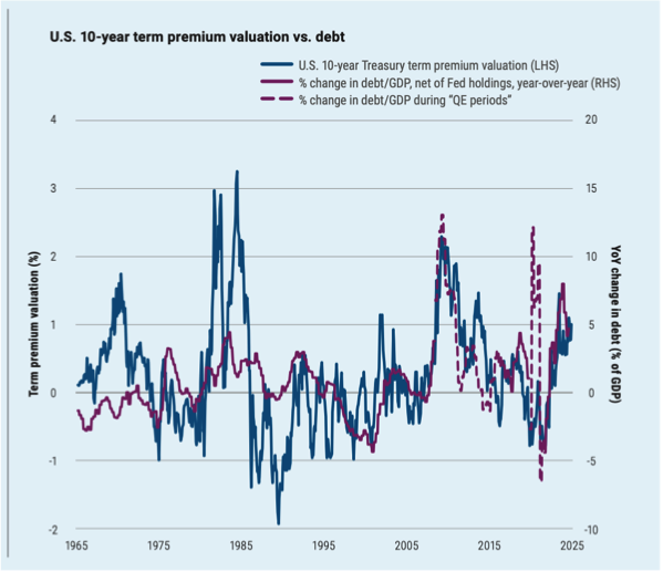 Con todo este telón de fondo, es importante señalar una relación débil pero observable entre el aumento de los ratios de deuda en relación con el PIB (excluidas las tenencias de la Reserva Federal) y la prima por plazo de los bonos del Tesoro estadounidense a 10 años, es decir, el rendimiento adicional que exigen los inversores por mantener bonos a más largo plazo. A medida que aumenta la deuda pública, la prima por plazo tiende a aumentar, ya que los inversores exigen una mayor compensación por mantener bonos a más largo plazo en comparación con el efectivo y los pagarés a corto plazo.