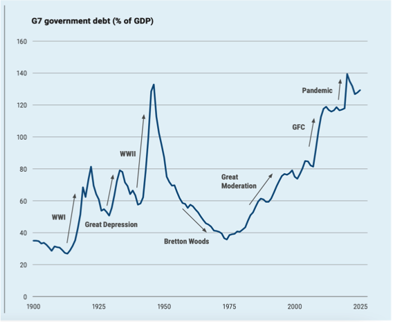 Peder Beck-Friis (PIMCO) | Los niveles de deuda pública de los países del G7 han fluctuado a lo largo de la historia. Aumentaron considerablemente durante las grandes crisis —la Primera Guerra Mundial, la Gran Depresión y la Segunda Guerra Mundial— y luego disminuyeron durante el auge de la posguerra.