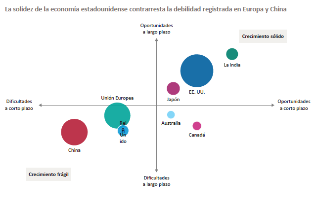 Capital Group | Estados Unidos, en su papel de mayor economía del mundo, recupera su protagonismo como motor del crecimiento de la economía mundial. Frente a la débil actividad económica a la que se enfrentan Europa y China, las economías de Estados Unidos, la India y Japón muestran indicios de solidez.
