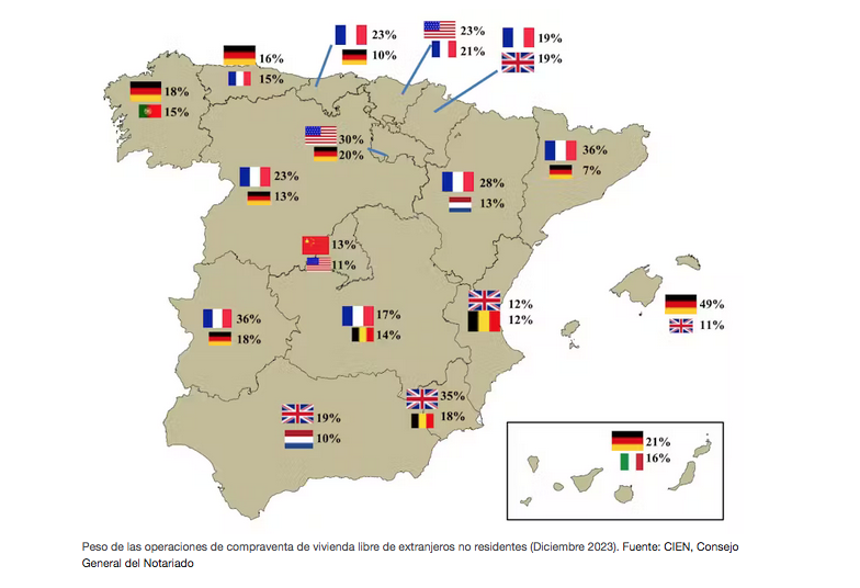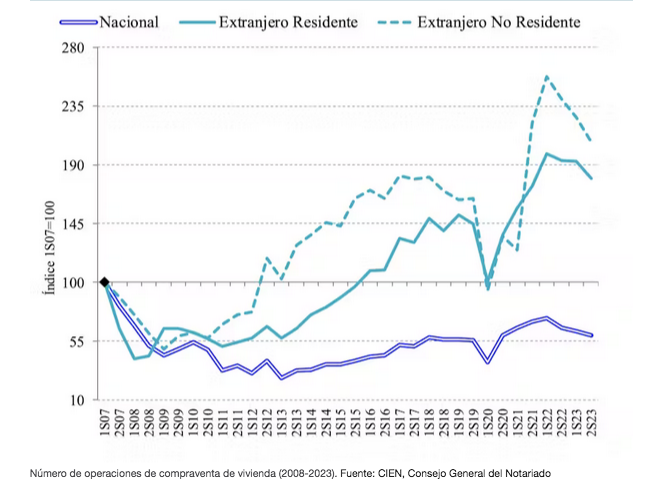 Del total de operaciones de compraventa de inmuebles de 2023, las efectuadas por extranjeros representaron un 20,9 %. Sobre ese porcentaje, el 42,9% de las compras fueron efectuadas por extranjeros no residentes. Una cifra considerable, tomando en cuenta que son el grupo comprador que paga más caro el metro cuadrado de vivienda (2 715 €, frente a los 1 720 €/m² que pagan los extranjeros residentes y los 1 580 €/m² de los nacionales).