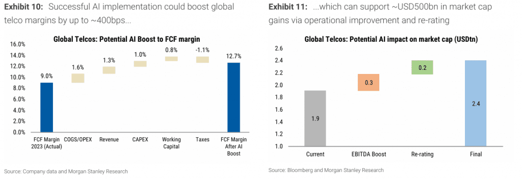 Morgan Stanley | Frente a otras industrias, telecoms es una industria muy intensiva en el uso de datos, que opera con una combinación compleja de sistemas legacy/modernos y con una alta necesidad de mejorar eficiencias en entorno de limitado poder en precios. El sector tiene muchos incentivos/potenciales beneficios de incorporar la IA, aunque las conversaciones con operadores y expertos de IA reflejan que la adopción está en fases muy iniciales y aún hay muchas dudas.