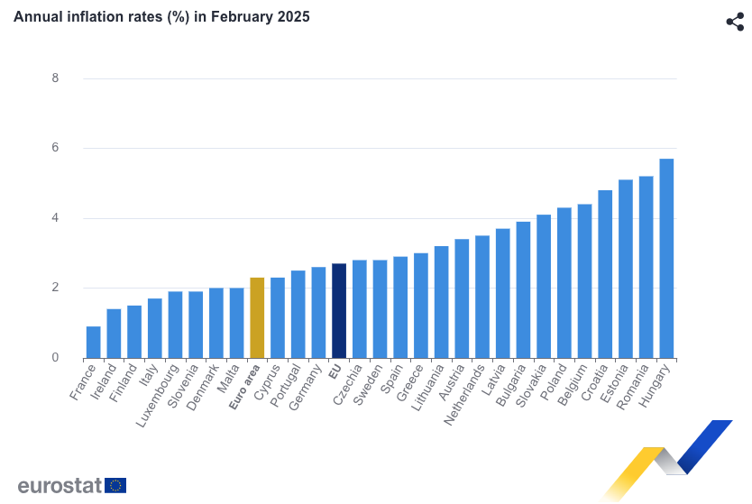 En toda la UE, la inflación anual fue del 2,7%, en comparación con el 2,8% de enero.
