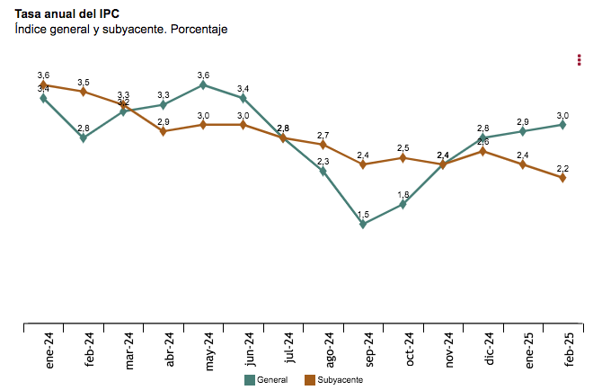 Mientras, la tasa de variación anual de la inflación subyacente, es decir, el índice general sin alimentos no elaborados ni productos energéticos, disminuyó dos décimas respecto a enero y se situó en el 2,2%, la tasa más baja desde diciembre de 2021.