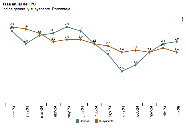 CdM | La inflación arrancó 2025 subiendo una décima, hasta situar su tasa interanual en el 2,9%, lo que supone el nivel más alto desde junio del año pasado y encadenar cuatro meses consecutivos de ascensos, según los datos definitivos publicados por el Instituto Nacional de Estadística (INE). No obstante, el dato de enero es una décima inferior al avanzado.