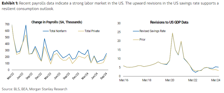 - En EEUU => En contra de las preocupaciones de los últimos meses (centradas especialmente en el mercado laboral, que era la única pieza rezagada dentro de un conjunto de datos que apuntaban a una economía, por lo demás, resiliente), la última lectura de payrolls ha rebotado y reafirmado la visión de Seth Carpenter (macro global) que espera una bajada de 25 p.b. en noviembre, posición hacia la que está convergiendo el mercado. A ello se le une la fortaleza en el consumo y retail sales que siguen sorprendiendo al alza. De hecho, nuestros expertos destacan que las últimas revisiones en los datos de consumo muestran un nivel de ahorros mucho más sólido de lo estimado inicialmente, por lo que considera que el outlook de consumo en EEUU podría ser incluso más positivo de lo esperado y lo que ha derivado en la revisión alcista del viernes pasado tanto del crecimiento esperado por el equipo macro de EEUU (Diego Anzoategui & Co) del consumo EEUU (del +3,1 al +3,6%) así como del crecimiento esperado del 3T (del 2,5% al 2,75%).