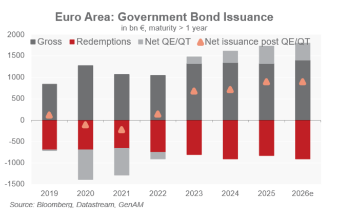 Florian Späete (Generali Investments) | Dado el ligero aumento del déficit presupuestario de la zona euro, prevemos que la emisión neta de bonos del Estado de la región se mantendrá en un nivel elevado en 2026, superando los 500.000 millones de euros. Como también se prevé un aumento de los reembolsos, anticipamos que la emisión bruta alcanzará un máximo histórico de más de 1,4 billones de euros. Cabe señalar además que el BCE mantendrá sin cambios su programa de endurecimiento cuantitativo el próximo año. Esto significa que la emisión neta (incluido el QT del BCE) ascenderá a casi 900.000 millones de euros (ligeramente superior a la de 2025). Tras caer drásticamente hasta el 36% en 2025, se prevé que la proporción de bonos a largo plazo (más de 10 años) siga disminuyendo en medio de un ligero aumento de la pendiente de la curva de rendimiento previsto para 2026.