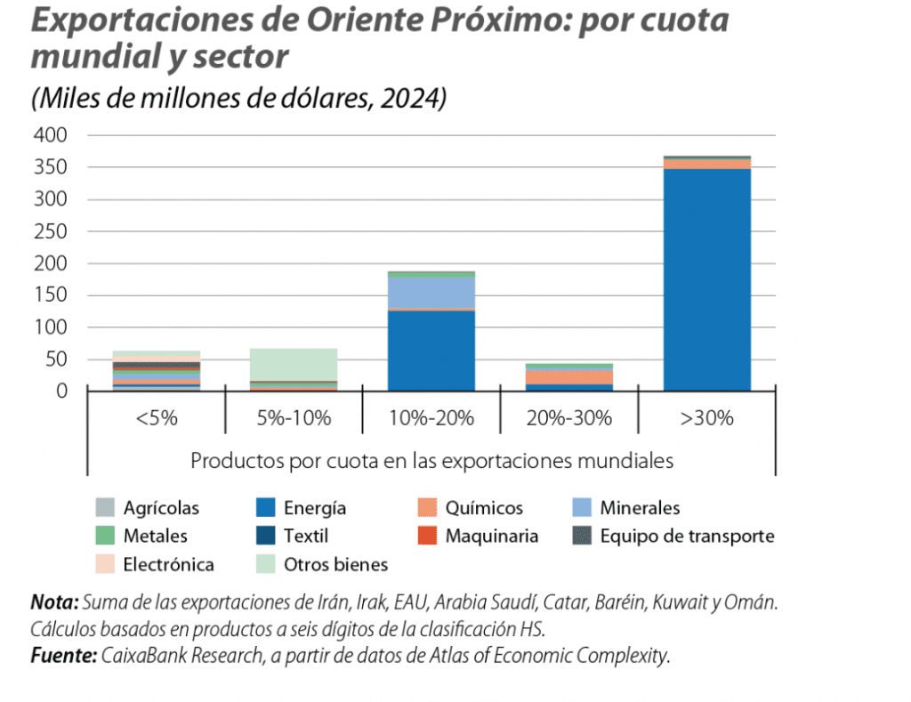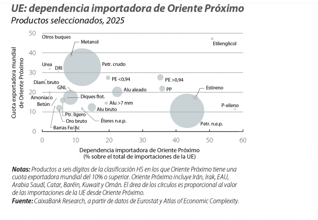 La relevancia económica de Oriente Próximo va mucho más allá de los mercados de petróleo y gas, cabeza más visible, a corto plazo, de los efectos de la guerra. Países como Arabia Saudí, Catar y EAU son importantes productores y exportadores de productos no energéticos, sobre todo en el sector químico y metalífero (véase el tercer gráfico). Entre ellos destacan nutrientes para la elaboración de fertilizantes, como la urea, cuya producción en el conjunto de la región suma cerca de un tercio de las exportaciones mundiales, y de las que India y Brasil son altamente dependientes. También la provisión de materias primas fundamentales para un amplio abanico de productos plásticos, como el etilenglicol, el polietileno (PE) o el polipropileno (PP), que representan más del 25% de la cuota mundial, siendo Asia el principal cliente. O el aluminio y sus aleaciones (cuota del 15%), destinados a la metalurgia, la automoción, la construcción o la maquinaria, del que Europa es uno de los mayores compradores (véase el mapa de principales dependencias importadoras de la UE en el cuarto gráfico).